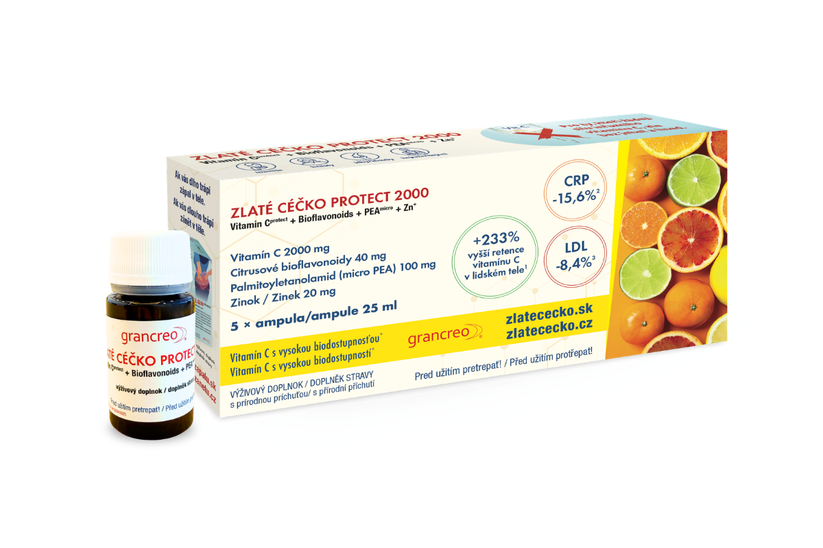Zlaté Céčko PROTECT 2000 není jen další doplněk vitamínu C. Je to inovativní orální forma vitamínu C s téměř 90% biologickou účinností v imunitních buňkách, vyvinutá jako pohodlná alternativa k infuznímu vitamínu C.